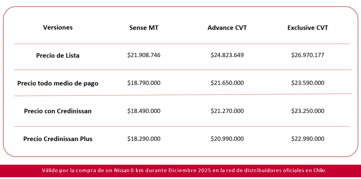 (1) Simulación corresponde crédito Convencional (por Nissan Tanner Financial Services Retail SpA). Válido solo para el modelo Nissan SENTRA NCF Advance CVT. Precio de lista $ 24.823.649. Precio con bono $ 21.270.000, incluye bono de $ 3.553.649 con financiamiento de Credinissan. 60 cuotas de $ 383.990 y con un pie de 40% ($ 8.508.000). CAE 0,26, Costo total del Crédito $ 23.039.400, Valor del Crédito $ 13.861.849, Costo total del Vehículo $ 31.547.400. Crédito sujeto previamente a verificación de antecedentes financieros y comerciales del Cliente. Crédito incluye gastos operacionales, impuesto al mutuo y seguro de desgravamen.La contratación de cualquier seguro asociado es de carácter voluntario para el Cliente. Promoción válida para los primeros 30 clientes que lo soliciten y que cumplan las condiciones mínimas para acceder cualquier financiamiento de vehículos Nissan. Promoción no aplica para Zona Franca. Promoción válida hasta 31 de diciembre 2025 . Stock máximo de 30 unidades. Credinissan se reserva el derecho de eliminar o modificar la presente promoción sin ulterior responsabilidad. Revisa bases legales de la promoción en www.nissan.cl (2) Simulación corresponde crédito Credinissan Plus (por Nissan Tanner Financial Services Retail SpA). Válido solo para el modelo Nissan SENTRA NCF Advance CVT. Precio de lista $ 24.823.649. Precio con bono $ 20.990.000, incluye bono de $ 3.833.649 con financiamiento de Credinissan. 60 cuotas de $ 207.990, con un pie de 60% ($ 12.594.000) y un VFMG de $ 5.247.500. CAE 25,86%, Costo total del Crédito $ 17.726.900, Valor del Crédito $ 9.242.763, Costo total del Vehículo $ 30.320.900. Crédito sujeto previamente a verificación de antecedentes financieros y comerciales del Cliente. Crédito incluye gastos operacionales, impuesto al mutuo y seguro de desgravamen.La contratación de cualquier seguro asociado es de carácter voluntario para el Cliente. Promoción válida para los primeros 30 clientes que lo soliciten y que cumplan las condiciones mínimas para acceder cualquier financiamiento de vehículos Nissan. Promoción no aplica para Zona Franca. Promoción válida hasta 31 de diciembre 2025. Stock máximo de 30 unidades. Credinissan se reserva el derecho de eliminar o modificar la presente promoción sin ulterior responsabilidad. Revisa bases legales de la promoción en www.nissan.cl