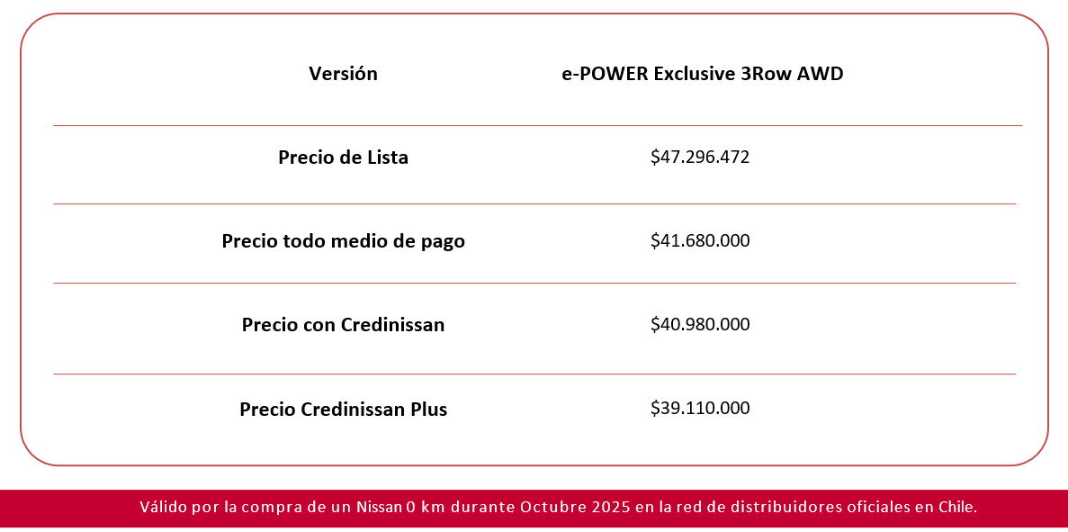 (1) Simulación corresponde crédito Convencional (por Nissan Tanner Financial Services Retail SpA). Válido solo para el modelo Nissan NEW X-TRAIL e-POWER Exclusive e-POWER. Precio de lista $ 47.296.472. Precio con bono $ 40.980.000, incluye bono de $ 6.316.472 con financiamiento de Credinissan. 60 cuotas de $ 701.990 y con un pie de 40% ($ 16.392.000). CAE 0,24, Costo total del Crédito $ 42.119.400, Valor del Crédito $ 26.375.682, Costo total del Vehículo $ 58.511.400. Crédito sujeto previamente a verificación de antecedentes financieros y comerciales del Cliente. Crédito incluye gastos operacionales, impuesto al mutuo y seguro de desgravamen.La contratación de cualquier seguro asociado es de carácter voluntario para el Cliente. Promoción válida para los primeros 30 clientes que lo soliciten y que cumplan las condiciones mínimas para acceder cualquier financiamiento de vehículos Nissan. Promoción no aplica para Zona Franca. Promoción válida hasta 31 de octubre 2025 . Stock máximo de 30 unidades. Credinissan se reserva el derecho de eliminar o modificar la presente promoción sin ulterior responsabilidad. Revisa bases legales de la promoción en www.nissan.cl (2) Simulación corresponde crédito Credinissan Plus (por Nissan Tanner Financial Services Retail SpA). Válido solo para el modelo Nissan NEW X-TRAIL e-POWER Exclusive e-POWER. Precio de lista $ 47.296.472. Precio con bono $ 39.110.000, incluye bono de $ 8.186.472 con financiamiento de Credinissan. 60 cuotas de $ 355.990, con un pie de 60% ($ 23.466.000) y un VFMG de $ 9.777.500. CAE 23,13%, Costo total del Crédito $ 31.136.900, Valor del Crédito $ 16.912.251, Costo total del Vehículo $ 54.602.900. Crédito sujeto previamente a verificación de antecedentes financieros y comerciales del Cliente. Crédito incluye gastos operacionales, impuesto al mutuo y seguro de desgravamen.La contratación de cualquier seguro asociado es de carácter voluntario para el Cliente. Promoción válida para los primeros 30 clientes que lo soliciten y que cumplan las condiciones mínimas para acceder cualquier financiamiento de vehículos Nissan. Promoción no aplica para Zona Franca. Promoción válida hasta 31 de octubre 2025. Stock máximo de 30 unidades. Credinissan se reserva el derecho de eliminar o modificar la presente promoción sin ulterior responsabilidad. Revisa bases legales de la promoción en www.nissan.cl