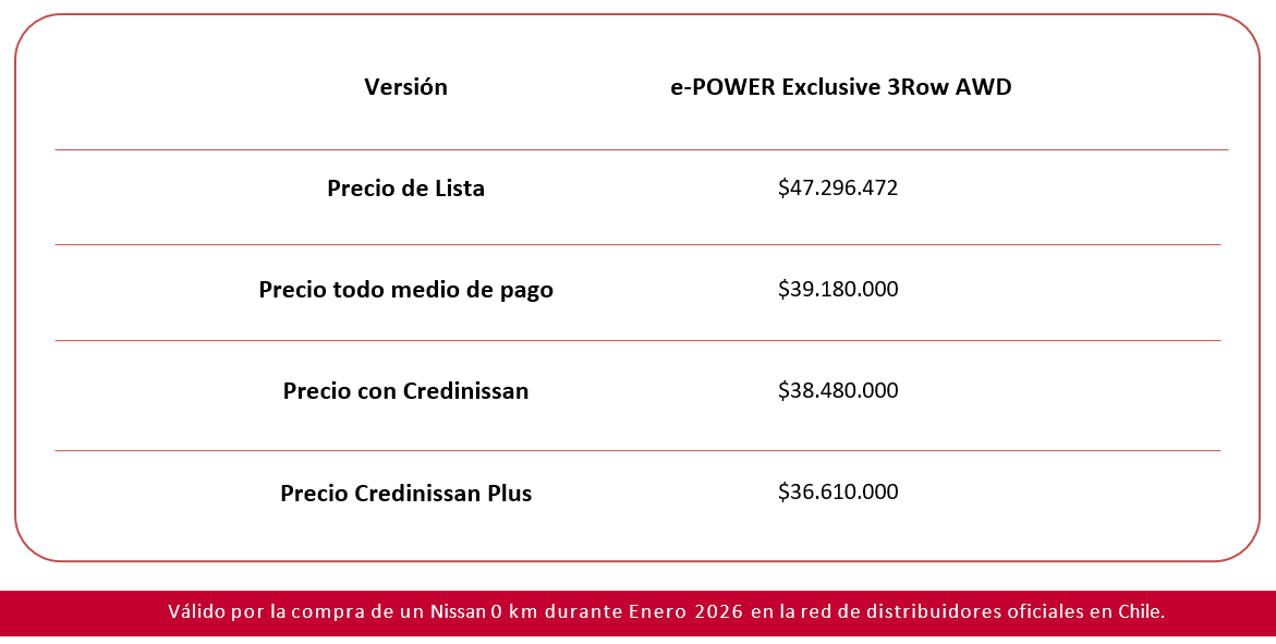 (1) Simulación corresponde crédito Convencional (por Nissan Tanner Financial Services Retail SpA). Válido solo para el modelo Nissan NEW X-TRAIL e-POWER Exclusive e-POWER. Precio de lista $ 47.296.472. Precio con bono $ 38.480.000, incluye bono de $ 8.816.472 con financiamiento de Credinissan. 60 cuotas de $ 644.990 y con un pie de 40% ($ 15.392.000). CAE 0,23, Costo total del Crédito $ 38.699.400, Valor del Crédito $ 24.788.602, Costo total del Vehículo $ 54.091.400. Crédito sujeto previamente a verificación de antecedentes financieros y comerciales del Cliente. Crédito incluye gastos operacionales, impuesto al mutuo y seguro de desgravamen.La contratación de cualquier seguro asociado es de carácter voluntario para el Cliente. Promoción válida para los primeros 30 clientes que lo soliciten y que cumplan las condiciones mínimas para acceder cualquier financiamiento de vehículos Nissan. Promoción no aplica para Zona Franca. Promoción válida hasta 31 de enero 2026 . Stock máximo de 30 unidades. Credinissan se reserva el derecho de eliminar o modificar la presente promoción sin ulterior responsabilidad. Revisa bases legales de la promoción en www.nissan.cl (2) Simulación corresponde crédito Credinissan Plus (por Nissan Tanner Financial Services Retail SpA). Válido solo para el modelo Nissan NEW X-TRAIL e-POWER Exclusive e-POWER. Precio de lista $ 47.296.472. Precio con bono $ 36.610.000, incluye bono de $ 10.686.472 con financiamiento de Credinissan. 60 cuotas de $ 321.990, con un pie de 60% ($ 21.966.000) y un VFMG de $ 9.152.500. CAE 22,09%, Costo total del Crédito $ 28.471.900, Valor del Crédito $ 15.854.263, Costo total del Vehículo $ 50.437.900. Crédito sujeto previamente a verificación de antecedentes financieros y comerciales del Cliente. Crédito incluye gastos operacionales, impuesto al mutuo y seguro de desgravamen.La contratación de cualquier seguro asociado es de carácter voluntario para el Cliente. Promoción válida para los primeros 30 clientes que lo soliciten y que cumplan las condiciones mínimas para acceder cualquier financiamiento de vehículos Nissan. Promoción no aplica para Zona Franca. Promoción válida hasta 31 de enero 2026. Stock máximo de 30 unidades. Credinissan se reserva el derecho de eliminar o modificar la presente promoción sin ulterior responsabilidad. Revisa bases legales de la promoción en www.nissan.cl