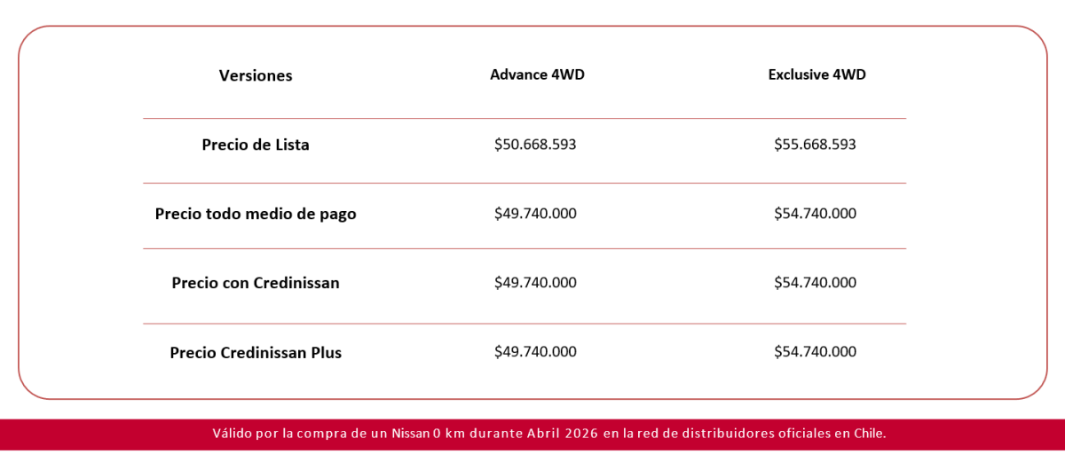 (1) Simulación corresponde crédito Convencional (por Nissan Tanner Financial Services Retail SpA). Válido solo para el modelo Nissan NEW PATHFINDER Exclusive 4WD. Precio de lista $ 55.668.593. Precio con bono $ 54.740.000, incluye bono de $ 928.593 con financiamiento de Credinissan. 60 cuotas de $ 912.990 y con un pie de 40% ($ 21.896.000). CAE 0,22, Costo total del Crédito $ 54.779.400, Valor del Crédito $ 35.112.193, Costo total del Vehículo $ 76.675.400. Crédito sujeto previamente a verificación de antecedentes financieros y comerciales del Cliente. Crédito incluye gastos operacionales, impuesto al mutuo y seguro de desgravamen.La contratación de cualquier seguro asociado es de carácter voluntario para el Cliente. Promoción válida para los primeros 30 clientes que lo soliciten y que cumplan las condiciones mínimas para acceder cualquier financiamiento de vehículos Nissan. Promoción no aplica para Zona Franca. Promoción válida hasta 30 de abril 2026 . Stock máximo de 30 unidades. Credinissan se reserva el derecho de eliminar o modificar la presente promoción sin ulterior responsabilidad. Revisa bases legales de la promoción en www.nissan.cl (2) Simulación corresponde crédito Credinissan Plus (por Nissan Tanner Financial Services Retail SpA). Válido solo para el modelo Nissan NEW PATHFINDER Exclusive 4WD. Precio de lista $ 55.668.593. Precio con bono $ 54.740.000, incluye bono de $ 928.593 con financiamiento de Credinissan. 60 cuotas de $ 475.990, con un pie de 60% ($ 32.844.000) y un VFMG de $ 13.685.000. CAE 21,75%, Costo total del Crédito $ 42.244.400, Valor del Crédito $ 23.528.175, Costo total del Vehículo $ 75.088.400. Crédito sujeto previamente a verificación de antecedentes financieros y comerciales del Cliente. Crédito incluye gastos operacionales, impuesto al mutuo y seguro de desgravamen.La contratación de cualquier seguro asociado es de carácter voluntario para el Cliente. Promoción válida para los primeros 30 clientes que lo soliciten y que cumplan las condiciones mínimas para acceder cualquier financiamiento de vehículos Nissan. Promoción no aplica para Zona Franca. Promoción válida hasta 30 de abril 2026. Stock máximo de 30 unidades. Credinissan se reserva el derecho de eliminar o modificar la presente promoción sin ulterior responsabilidad. Revisa bases legales de la promoción en www.nissan.cl