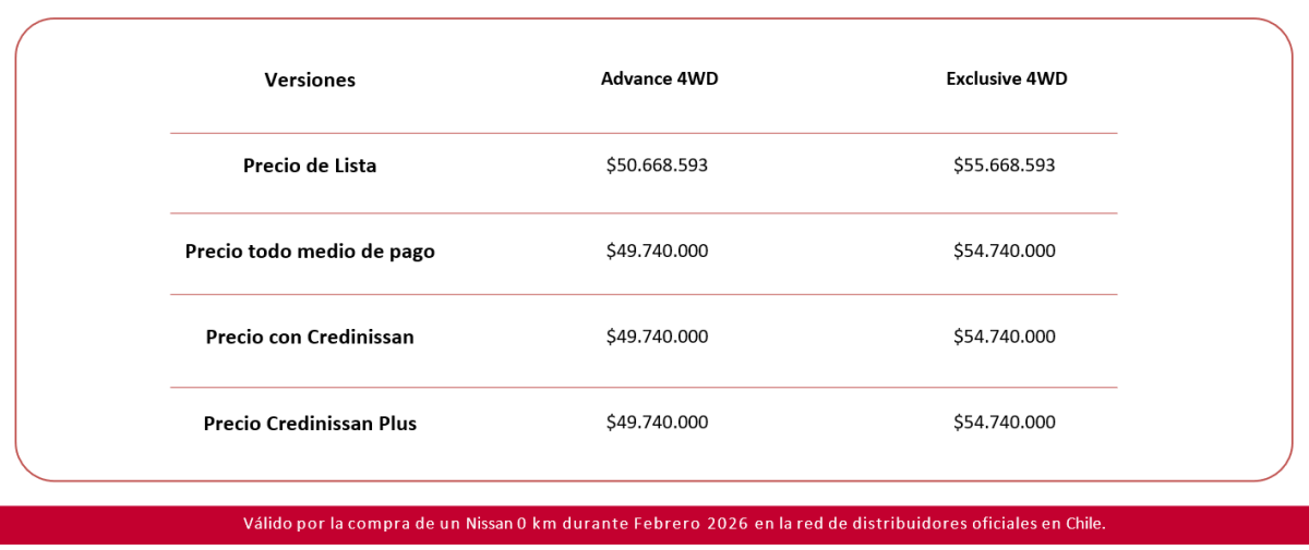 (1) Simulación corresponde crédito Convencional (por Nissan Tanner Financial Services Retail SpA). Válido solo para el modelo Nissan NEW PATHFINDER Exclusive 4WD. Precio de lista $ 55.668.593. Precio con bono $ 54.740.000, incluye bono de $ 928.593 con financiamiento de Credinissan. 60 cuotas de $ 912.990 y con un pie de 40% ($ 21.896.000). CAE 0,22, Costo total del Crédito $ 54.779.400, Valor del Crédito $ 35.112.193, Costo total del Vehículo $ 76.675.400. Crédito sujeto previamente a verificación de antecedentes financieros y comerciales del Cliente. Crédito incluye gastos operacionales, impuesto al mutuo y seguro de desgravamen.La contratación de cualquier seguro asociado es de carácter voluntario para el Cliente. Promoción válida para los primeros 30 clientes que lo soliciten y que cumplan las condiciones mínimas para acceder cualquier financiamiento de vehículos Nissan. Promoción no aplica para Zona Franca. Promoción válida hasta 28 de febrero 2026 . Stock máximo de 30 unidades. Credinissan se reserva el derecho de eliminar o modificar la presente promoción sin ulterior responsabilidad. Revisa bases legales de la promoción en www.nissan.cl (2) Simulación corresponde crédito Credinissan Plus (por Nissan Tanner Financial Services Retail SpA). Válido solo para el modelo Nissan NEW PATHFINDER Exclusive 4WD. Precio de lista $ 55.668.593. Precio con bono $ 54.740.000, incluye bono de $ 928.593 con financiamiento de Credinissan. 60 cuotas de $ 475.990, con un pie de 60% ($ 32.844.000) y un VFMG de $ 13.685.000. CAE 21,75%, Costo total del Crédito $ 42.244.400, Valor del Crédito $ 23.528.175, Costo total del Vehículo $ 75.088.400. Crédito sujeto previamente a verificación de antecedentes financieros y comerciales del Cliente. Crédito incluye gastos operacionales, impuesto al mutuo y seguro de desgravamen.La contratación de cualquier seguro asociado es de carácter voluntario para el Cliente. Promoción válida para los primeros 30 clientes que lo soliciten y que cumplan las condiciones mínimas para acceder cualquier financiamiento de vehículos Nissan. Promoción no aplica para Zona Franca. Promoción válida hasta 28 de febrero 2026. Stock máximo de 30 unidades. Credinissan se reserva el derecho de eliminar o modificar la presente promoción sin ulterior responsabilidad. Revisa bases legales de la promoción en www.nissan.cl