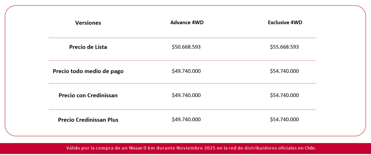 (1) Simulación corresponde crédito Convencional (por Nissan Tanner Financial Services Retail SpA). Válido solo para el modelo Nissan NEW PATHFINDER Advance CVT 4WD. Precio de lista $ 50.668.593. Precio con bono $ 49.740.000, incluye bono de $ 928.593 con financiamiento de Credinissan. 60 cuotas de $ 832.990 y con un pie de 40% ($ 19.896.000). CAE 0,23, Costo total del Crédito $ 49.979.400, Valor del Crédito $ 32.056.146, Costo total del Vehículo $ 69.875.400. Crédito sujeto previamente a verificación de antecedentes financieros y comerciales del Cliente. Crédito incluye gastos operacionales, impuesto al mutuo y seguro de desgravamen.La contratación de cualquier seguro asociado es de carácter voluntario para el Cliente. Promoción válida para los primeros 30 clientes que lo soliciten y que cumplan las condiciones mínimas para acceder cualquier financiamiento de vehículos Nissan. Promoción no aplica para Zona Franca. Promoción válida hasta 30 de noviembre 2025 . Stock máximo de 30 unidades. Credinissan se reserva el derecho de eliminar o modificar la presente promoción sin ulterior responsabilidad. Revisa bases legales de la promoción en www.nissan.cl (2) Simulación corresponde crédito Credinissan Plus (por Nissan Tanner Financial Services Retail SpA). Válido solo para el modelo Nissan NEW PATHFINDER Advance CVT 4WD. Precio de lista $ 50.668.593. Precio con bono $ 49.740.000, incluye bono de $ 928.593 con financiamiento de Credinissan. 60 cuotas de $ 435.990, con un pie de 60% ($ 29.844.000) y un VFMG de $ 12.435.000. CAE 21,99%, Costo total del Crédito $ 38.594.400, Valor del Crédito $ 21.491.256, Costo total del Vehículo $ 68.438.400. Crédito sujeto previamente a verificación de antecedentes financieros y comerciales del Cliente. Crédito incluye gastos operacionales, impuesto al mutuo y seguro de desgravamen.La contratación de cualquier seguro asociado es de carácter voluntario para el Cliente. Promoción válida para los primeros 30 clientes que lo soliciten y que cumplan las condiciones mínimas para acceder cualquier financiamiento de vehículos Nissan. Promoción no aplica para Zona Franca. Promoción válida hasta 30 de noviembre 2025. Stock máximo de 30 unidades. Credinissan se reserva el derecho de eliminar o modificar la presente promoción sin ulterior responsabilidad. Revisa bases legales de la promoción en www.nissan.cl