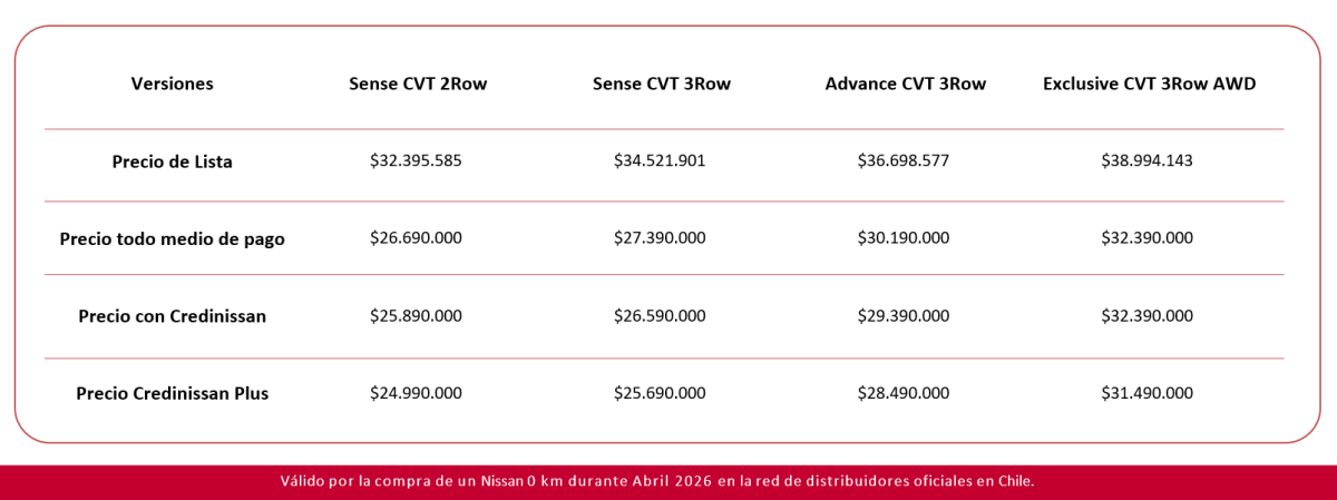 (1) Simulación corresponde crédito Convencional (por Nissan Tanner Financial Services Retail SpA). Válido solo para el modelo Nissan NEW X-TRAIL SENSE CVT 3Row. Precio de lista $ 34.521.901. Precio con bono $ 26.590.000, incluye bono de $ 7.931.901 con financiamiento de Credinissan. 60 cuotas de $ 447.990 y con un pie de 40% ($ 10.636.000). CAE 0,23, Costo total del Crédito $ 26.879.400, Valor del Crédito $ 17.239.555, Costo total del Vehículo $ 37.515.400. Crédito sujeto previamente a verificación de antecedentes financieros y comerciales del Cliente. Crédito incluye gastos operacionales, impuesto al mutuo y seguro de desgravamen.La contratación de cualquier seguro asociado es de carácter voluntario para el Cliente. Promoción válida para los primeros 30 clientes que lo soliciten y que cumplan las condiciones mínimas para acceder cualquier financiamiento de vehículos Nissan. Promoción no aplica para Zona Franca. Promoción válida hasta 30 de abril 2026 . Stock máximo de 30 unidades. Credinissan se reserva el derecho de eliminar o modificar la presente promoción sin ulterior responsabilidad. Revisa bases legales de la promoción en www.nissan.cl (2) Simulación corresponde crédito Credinissan Plus (por Nissan Tanner Financial Services Retail SpA). Válido solo para el modelo Nissan NEW X-TRAIL SENSE CVT 3Row. Precio de lista $ 34.521.901. Precio con bono $ 25.690.000, incluye bono de $ 8.831.901 con financiamiento de Credinissan. 60 cuotas de $ 228.990, con un pie de 60% ($ 15.414.000) y un VFMG de $ 6.422.500. CAE 22,49%, Costo total del Crédito $ 20.161.900, Valor del Crédito $ 11.232.139, Costo total del Vehículo $ 35.575.900. Crédito sujeto previamente a verificación de antecedentes financieros y comerciales del Cliente. Crédito incluye gastos operacionales, impuesto al mutuo y seguro de desgravamen.La contratación de cualquier seguro asociado es de carácter voluntario para el Cliente. Promoción válida para los primeros 30 clientes que lo soliciten y que cumplan las condiciones mínimas para acceder cualquier financiamiento de vehículos Nissan. Promoción no aplica para Zona Franca. Promoción válida hasta 30 de abril 2026. Stock máximo de 30 unidades. Credinissan se reserva el derecho de eliminar o modificar la presente promoción sin ulterior responsabilidad. Revisa bases legales de la promoción en www.nissan.cl