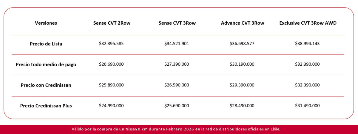 (1) Simulación corresponde crédito Convencional (por Nissan Tanner Financial Services Retail SpA). Válido solo para el modelo Nissan NEW X-TRAIL SENSE CVT 3Row. Precio de lista $ 34.521.901. Precio con bono $ 26.590.000, incluye bono de $ 7.931.901 con financiamiento de Credinissan. 60 cuotas de $ 447.990 y con un pie de 40% ($ 10.636.000). CAE 0,23, Costo total del Crédito $ 26.879.400, Valor del Crédito $ 17.239.555, Costo total del Vehículo $ 37.515.400. Crédito sujeto previamente a verificación de antecedentes financieros y comerciales del Cliente. Crédito incluye gastos operacionales, impuesto al mutuo y seguro de desgravamen.La contratación de cualquier seguro asociado es de carácter voluntario para el Cliente. Promoción válida para los primeros 30 clientes que lo soliciten y que cumplan las condiciones mínimas para acceder cualquier financiamiento de vehículos Nissan. Promoción no aplica para Zona Franca. Promoción válida hasta 28 de febrero 2026 . Stock máximo de 30 unidades. Credinissan se reserva el derecho de eliminar o modificar la presente promoción sin ulterior responsabilidad. Revisa bases legales de la promoción en www.nissan.cl (2) Simulación corresponde crédito Credinissan Plus (por Nissan Tanner Financial Services Retail SpA). Válido solo para el modelo Nissan NEW X-TRAIL SENSE CVT 3Row. Precio de lista $ 34.521.901. Precio con bono $ 25.690.000, incluye bono de $ 8.831.901 con financiamiento de Credinissan. 60 cuotas de $ 228.990, con un pie de 60% ($ 15.414.000) y un VFMG de $ 6.422.500. CAE 22,49%, Costo total del Crédito $ 20.161.900, Valor del Crédito $ 11.232.139, Costo total del Vehículo $ 35.575.900. Crédito sujeto previamente a verificación de antecedentes financieros y comerciales del Cliente. Crédito incluye gastos operacionales, impuesto al mutuo y seguro de desgravamen.La contratación de cualquier seguro asociado es de carácter voluntario para el Cliente. Promoción válida para los primeros 30 clientes que lo soliciten y que cumplan las condiciones mínimas para acceder cualquier financiamiento de vehículos Nissan. Promoción no aplica para Zona Franca. Promoción válida hasta 28 de febrero 2026. Stock máximo de 30 unidades. Credinissan se reserva el derecho de eliminar o modificar la presente promoción sin ulterior responsabilidad. Revisa bases legales de la promoción en www.nissan.cl