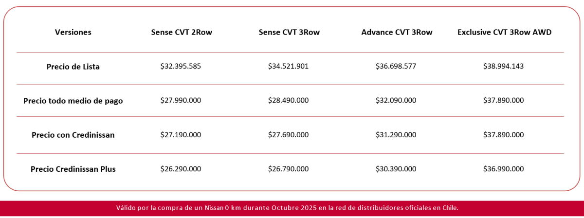 (1) Simulación corresponde crédito Convencional (por Nissan Tanner Financial Services Retail SpA). Válido solo para el modelo Nissan NEW X-TRAIL Exclusive CVT 3Row AWD. Precio de lista $ 38.994.143. Precio con bono $ 37.890.000, incluye bono de $ 1.104.143 con financiamiento de Credinissan. 60 cuotas de $ 648.990 y con un pie de 40% ($ 15.156.000). CAE 0,24, Costo total del Crédito $ 38.939.400, Valor del Crédito $ 24.413.819, Costo total del Vehículo $ 54.095.400. Crédito sujeto previamente a verificación de antecedentes financieros y comerciales del Cliente. Crédito incluye gastos operacionales, impuesto al mutuo y seguro de desgravamen.La contratación de cualquier seguro asociado es de carácter voluntario para el Cliente. Promoción válida para los primeros 30 clientes que lo soliciten y que cumplan las condiciones mínimas para acceder cualquier financiamiento de vehículos Nissan. Promoción no aplica para Zona Franca. Promoción válida hasta 31 de octubre 2025 . Stock máximo de 30 unidades. Credinissan se reserva el derecho de eliminar o modificar la presente promoción sin ulterior responsabilidad. Revisa bases legales de la promoción en www.nissan.cl (2) Simulación corresponde crédito Credinissan Plus (por Nissan Tanner Financial Services Retail SpA). Válido solo para el modelo Nissan NEW X-TRAIL Exclusive CVT 3Row AWD. Precio de lista $ 38.994.143. Precio con bono $ 36.990.000, incluye bono de $ 2.004.143 con financiamiento de Credinissan. 60 cuotas de $ 336.990, con un pie de 60% ($ 22.194.000) y un VFMG de $ 9.247.500. CAE 23,16%, Costo total del Crédito $ 29.466.900, Valor del Crédito $ 16.014.916, Costo total del Vehículo $ 51.660.900. Crédito sujeto previamente a verificación de antecedentes financieros y comerciales del Cliente. Crédito incluye gastos operacionales, impuesto al mutuo y seguro de desgravamen.La contratación de cualquier seguro asociado es de carácter voluntario para el Cliente. Promoción válida para los primeros 30 clientes que lo soliciten y que cumplan las condiciones mínimas para acceder cualquier financiamiento de vehículos Nissan. Promoción no aplica para Zona Franca. Promoción válida hasta 31 de octubre 2025. Stock máximo de 30 unidades. Credinissan se reserva el derecho de eliminar o modificar la presente promoción sin ulterior responsabilidad. Revisa bases legales de la promoción en www.nissan.cl