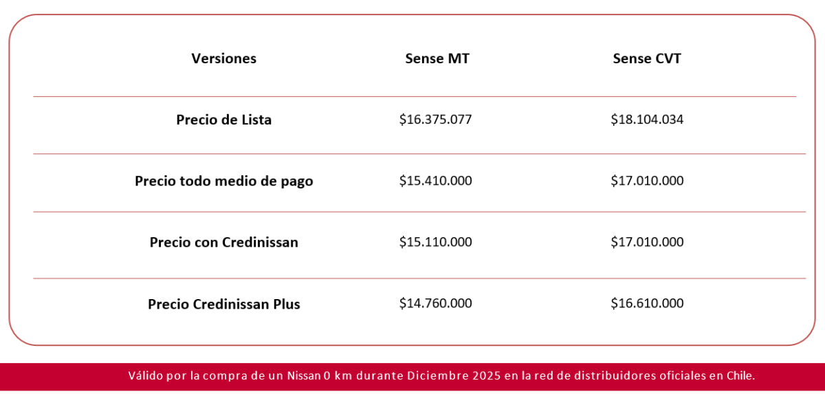 (1) Simulación corresponde crédito Convencional (por Nissan Tanner Financial Services Retail SpA). Válido solo para el modelo Nissan VERSA Sense MT. Precio de lista $ 16.375.077. Precio con bono $ 15.110.000, incluye bono de $ 1.265.077 con financiamiento de Credinissan. 60 cuotas de $ 283.990 y con un pie de 40% ($ 6.044.000). CAE 0,28, Costo total del Crédito $ 17.039.400, Valor del Crédito $ 9.950.821, Costo total del Vehículo $ 23.083.400. Crédito sujeto previamente a verificación de antecedentes financieros y comerciales del Cliente. Crédito incluye gastos operacionales, impuesto al mutuo y seguro de desgravamen.La contratación de cualquier seguro asociado es de carácter voluntario para el Cliente. Promoción válida para los primeros 30 clientes que lo soliciten y que cumplan las condiciones mínimas para acceder cualquier financiamiento de vehículos Nissan. Promoción no aplica para Zona Franca. Promoción válida hasta 31 de diciembre 2025 . Stock máximo de 30 unidades. Credinissan se reserva el derecho de eliminar o modificar la presente promoción sin ulterior responsabilidad. Revisa bases legales de la promoción en www.nissan.cl (2) Simulación corresponde crédito Credinissan Plus (por Nissan Tanner Financial Services Retail SpA). Válido solo para el modelo Nissan VERSA Sense MT. Precio de lista $ 16.375.077. Precio con bono $ 14.760.000, incluye bono de $ 1.615.077 con financiamiento de Credinissan. 60 cuotas de $ 168.990, con un pie de 60% ($ 8.856.000) y un VFMG de $ 3.690.000. CAE 31,00%, Costo total del Crédito $ 13.829.400, Valor del Crédito $ 6.605.782, Costo total del Vehículo $ 22.685.400. Crédito sujeto previamente a verificación de antecedentes financieros y comerciales del Cliente. Crédito incluye gastos operacionales, impuesto al mutuo y seguro de desgravamen.La contratación de cualquier seguro asociado es de carácter voluntario para el Cliente. Promoción válida para los primeros 30 clientes que lo soliciten y que cumplan las condiciones mínimas para acceder cualquier financiamiento de vehículos Nissan. Promoción no aplica para Zona Franca. Promoción válida hasta 31 de diciembre 2025. Stock máximo de 30 unidades. Credinissan se reserva el derecho de eliminar o modificar la presente promoción sin ulterior responsabilidad. Revisa bases legales de la promoción en www.nissan.cl